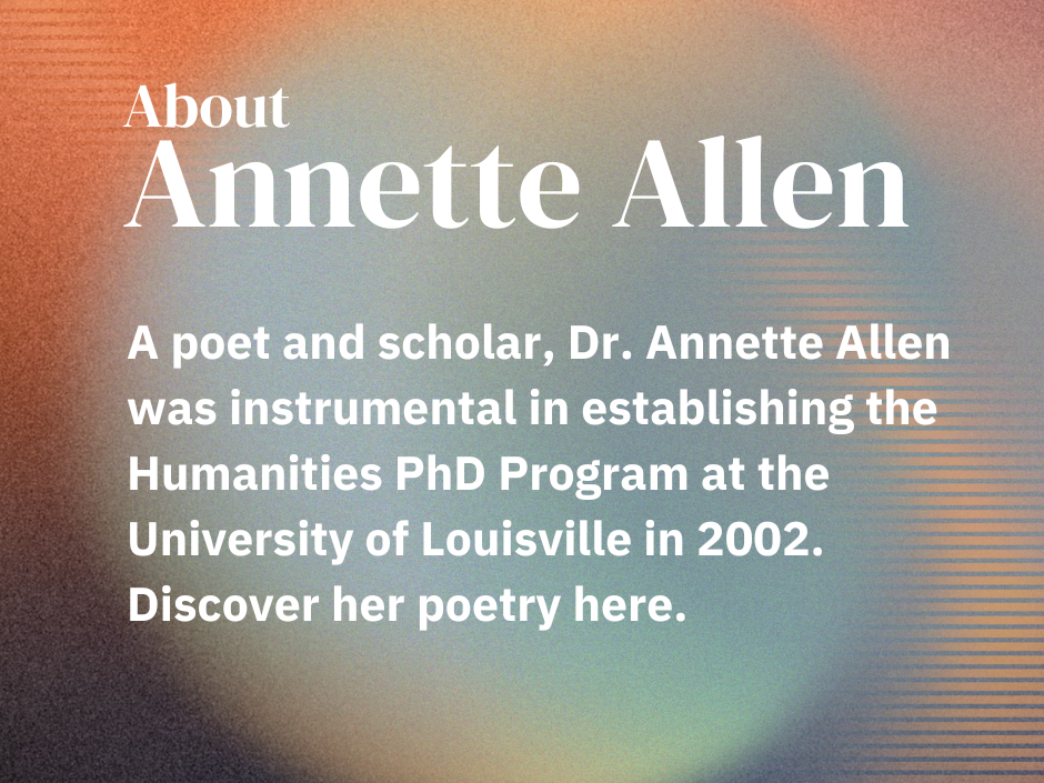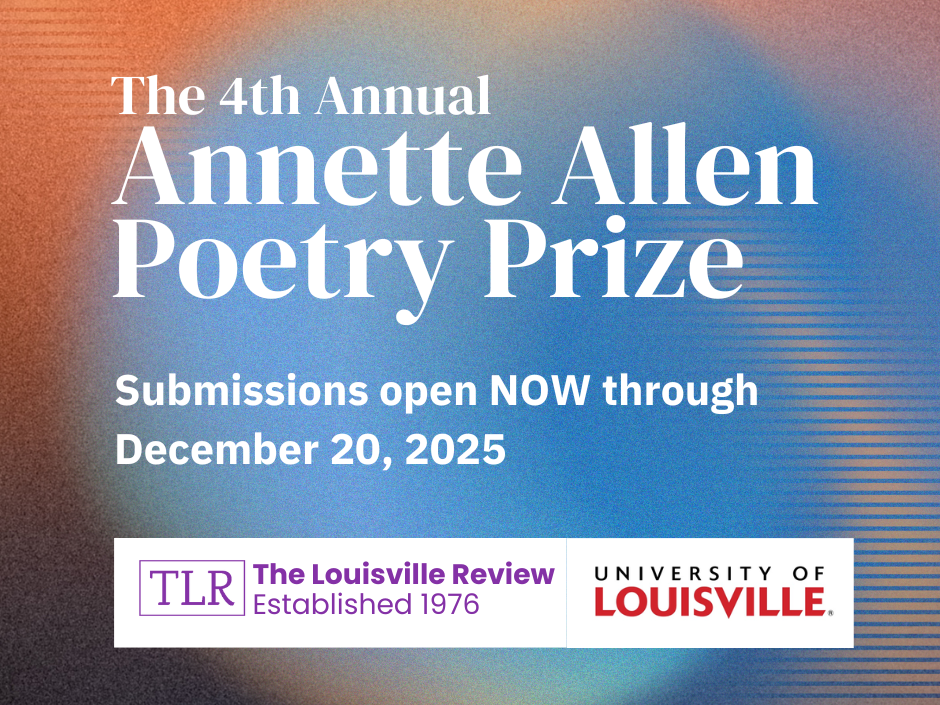 Submissions are now open for the 4th annual Annette Allen Poetry Prize! First prize is $300 + publication of a poem in The Louisville Review. Two Honorable Mentions will receive $50 each. All university and college students, both graduate and undergraduate, residing in the Louisville, KY metro area are eligible. Students from all disciplines are encouraged enter. We enthusiastically welcome entries from writers of all backgrounds, abilities, and identities, including minority, indigenous, and LGBTQ+ writers. We value poetry that draws on diverse perspectives, and we welcome poetry in a variety of registers, modes, and styles. Our esteemed Judge for the 4th annual Annette Allen Poetry Prize is Julia Johnson. Judge reads all submissions blind, and each poem is judged entirely on its own merit.